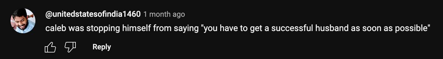 The flippant misogyny and lack of empathy is quite easy to spot in his Youtube comments, particularly on episodes featuring younger women and/or POCs. Some guests have reported that they were also bombarded with these types of remarks in their personal DMs following the release of their episodes. The guest's screenshots below also highlight her general discomfort and confusion around Caleb's abrasiveness and how to react in the midst of filming the episode.